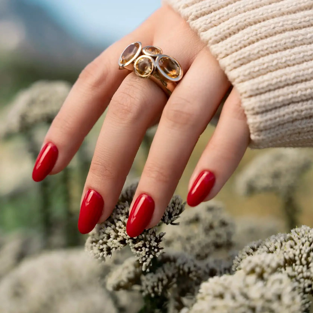 En sann rød med rosa undertoner istedenfor blå for å gi en varmere hudtone. Likhet med en strålende rose.