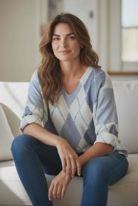 Super deilig og myk genser med nydelig harlequin mønster og V-hals i viscose, lana ull og angora.
