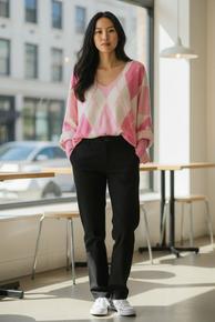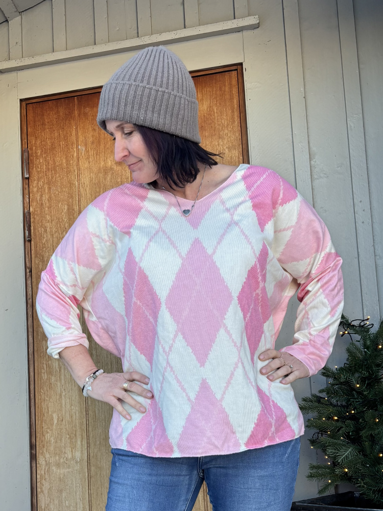 Super deilig og myk genser med nydelig harlequin mønster og V-hals i viscose, lana ull og angora.
