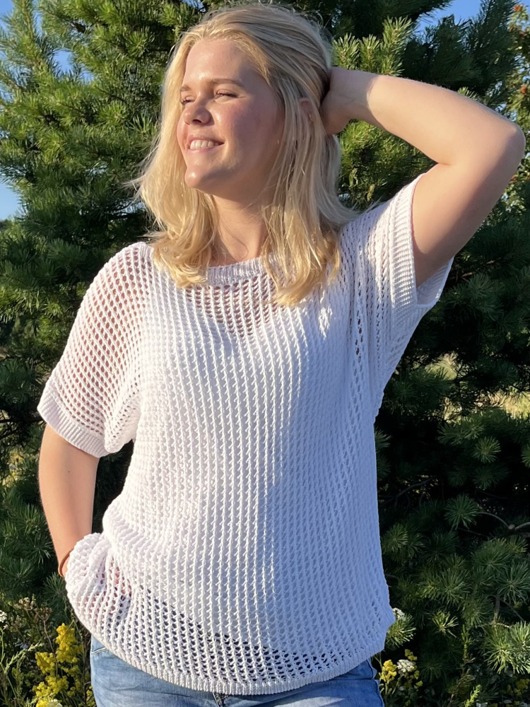 Løs singlet med heklet topp over. Finnes i tillegg i rosa, gul, olivengrønn og beige.